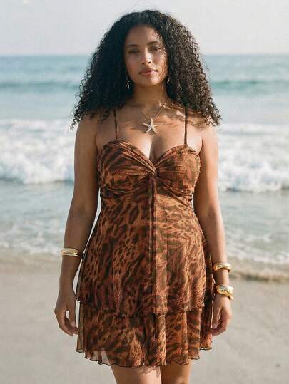 SHEIN BAE 大码短款连衣裙,带胸罩罩杯褶皱,吊带豹纹短裙,度假连衣裙