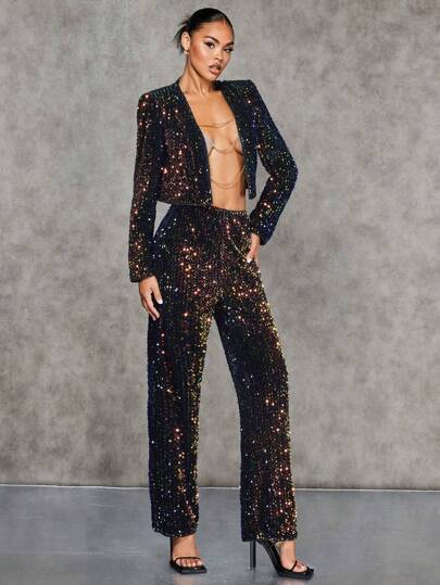 SHEIN BAE 女性華麗彩虹亮片直筒褲 - 黑色 - 查看 1