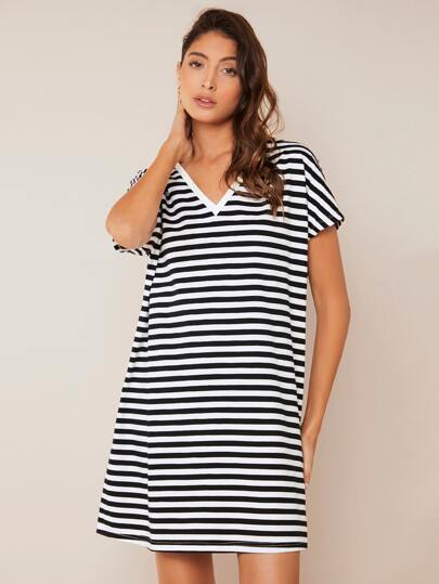 SHEIN BASICS 棉質條紋印花V領T恤連衣裙 - 黑色 - 查看 1