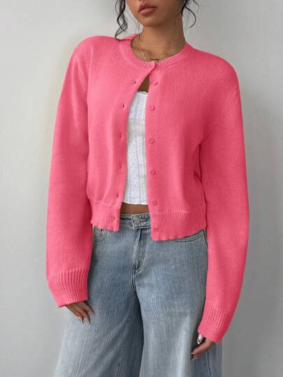 SHEIN BASICS 女士纯色圆领长袖宽松短款开衫 - 玫紅色 - 查看 1