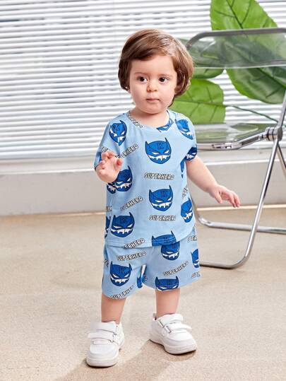 SHEIN 嬰兒男女休閒可愛卡通圖案針織短袖t恤短褲套裝 - 彩色 - 查看 1