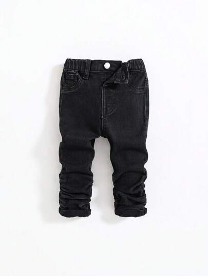 SHEIN 男婴时尚褶皱设计黑色牛仔裤,休闲百搭,适合男婴秋季服装 - 黑色 - 查看 1