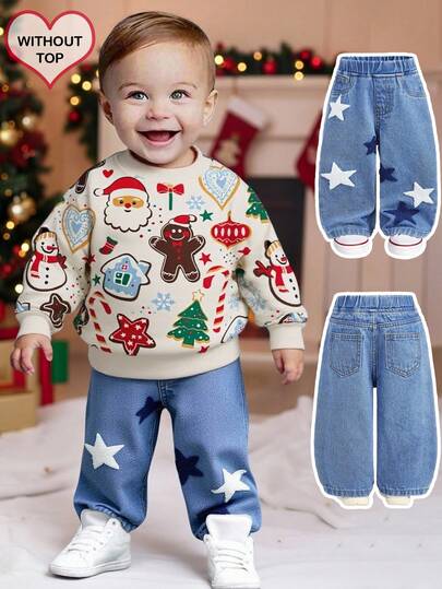 SHEIN 男婴休闲柔软可爱星星植绒弹力腰宽松蓝色牛仔裤,秋冬季百搭休闲,适合秋冬日常穿着、圣诞节、新年、感恩节等场合。 - 中等水洗藍 - 查看 5