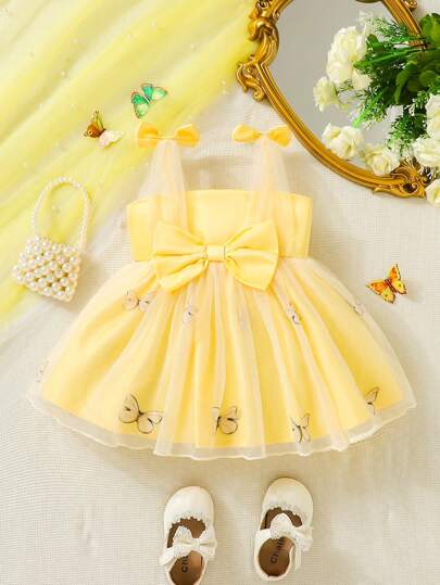 SHEIN 女嬰蝴蝶圖案肩部蝴蝶結網紗覆蓋吊帶洋裝 - 黃色 - 查看 1