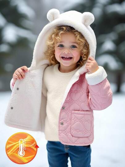 SHEIN 女婴休闲心形图案加厚连帽长袖夹克,粉色兔子图案,百搭冬季棉服 - 粉色 - 查看 1