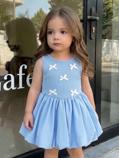 SHEIN 女婴可爱蝴蝶结针织无袖连体衣,蓝色,夏季