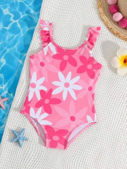 SHEIN 女婴可爱花卉印花荷叶边连体泳衣和沙滩装 - 粉色 - 查看 1