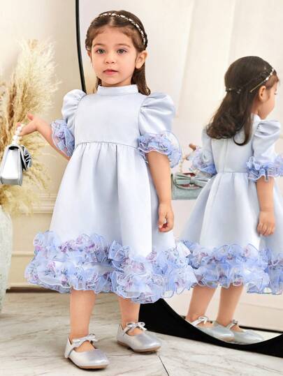 SHEIN 女婴立领短袖荷叶边缎面中长连衣裙 - 藍色 - 查看 1
