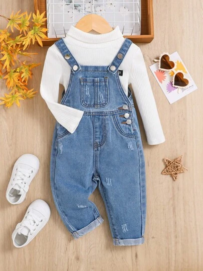 SHEIN 女嬰貓爪補丁牛仔背帶褲(無t恤) - 中等水洗藍 - 查看 1
