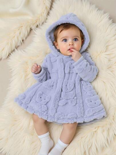 SHEIN 女宝宝休闲可爱保暖羊毛连帽连衣裙,适合秋冬季外出 - 淺藍色 - 查看 1