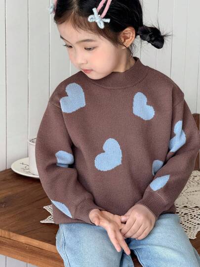 SHEIN 女婴休闲爱心图案落肩毛衣,秋冬季 - 彩色 - 查看 1