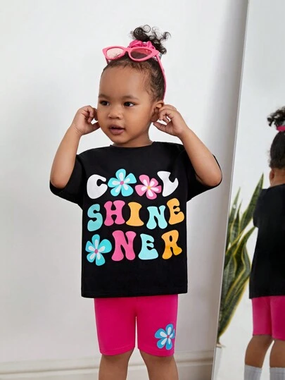 SHEIN 寶寶女孩可愛花卉和字母短袖T卹,連彈性腰短褲套裝 - 彩色 - 查看 1