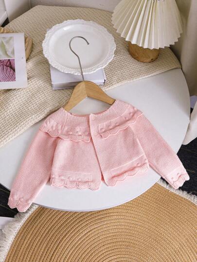 SHEIN 女宝宝时尚简约可爱荷叶边开衫毛衣,适合居家、外出和聚会 - 粉色 - 查看 1