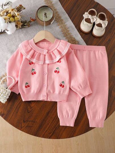 SHEIN 女婴加厚樱桃图案荷叶边针织开衫和针织裤两件套,秋冬季女婴毛衣套装,可爱粉色刺绣樱桃针织毛衣,刺绣圆领开衫和裤子套装,圆领长袖荷叶领毛衣两件套,毛衣和裤子两件套,柔软舒适