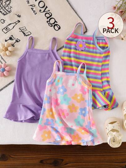 SHEIN 这款女童三件套吊带连衣裙,柔软舒适,简约清新,色彩缤纷,是夏季的理想之选。款式甜美俏皮,充满童趣。采用厚度适中的针织面料,A字鱼尾裙摆,饰以水果印花图案,荷叶边裙摆更添灵动可爱。适合日常外出、亲子活动、亲子装扮、居家休闲、参加派对和夏季花园聚会等各种场合。