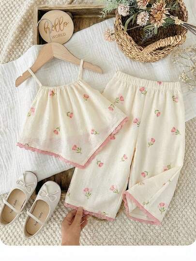 SHEIN 女婴可爱甜美碎花印花短袖上衣和松紧腰短裤套装