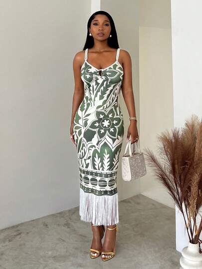 SHEIN BamGlam 性感吊带镂空海滨度假风连衣裙 - 綠色 - 查看 1