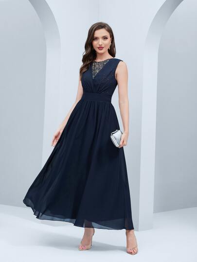 SHEIN Belle 亮片拼接後拉鏈伴娘連衣裙 - 藏蓝色 - 查看 1