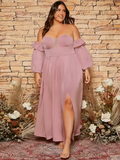 SHEIN Belle 大碼一字肩荷葉邊燈籠袖高開叉伴娘連衣裙 - 藕粉色 - 查看 1