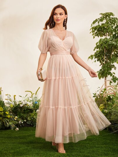 SHEIN Belle 泡泡袖交疊領荷葉邊圓點伴娘連衣裙 - 淺粉色 - 查看 1
