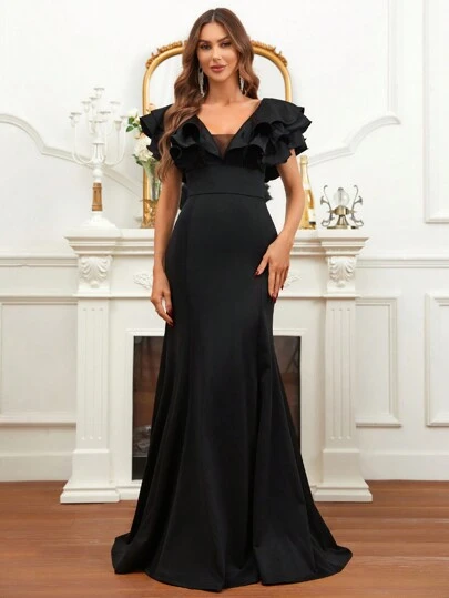 SHEIN Belle 荷葉邊魚尾裙下擺正式洋裝 - 黑色 - 查看 1