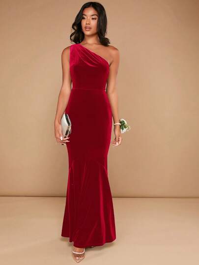 SHEIN Belle 女式优雅单肩鱼尾下摆连衣裙,夏季 - 紅色 - 查看 1