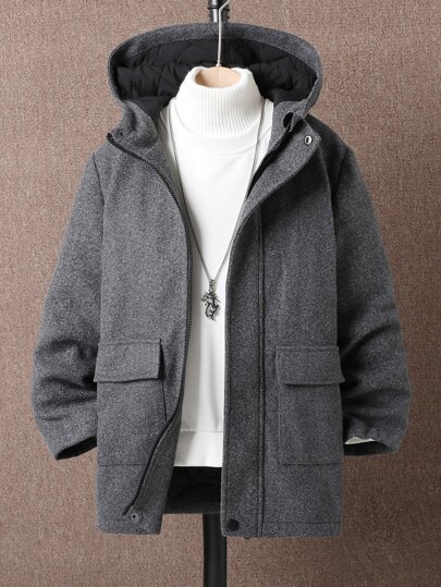 SHEIN 男孩1入組翻蓋口袋拉鍊連帽粗花呢花呢外套 - 深灰色 - 查看 1