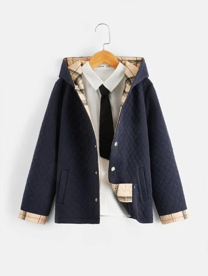SHEIN 男孩1入組格紋衍縫按扣連帽外套 - 藏蓝色 - 查看 1