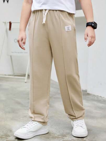 SHEIN 青少年男孩休闲字母图案直筒宽松针织纯色裤 - 卡其色 - 查看 1