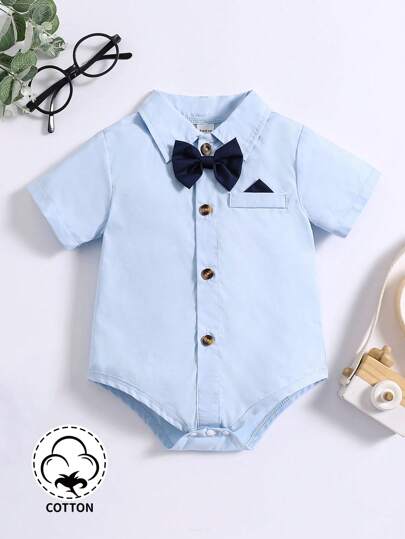 SHEIN 寶寶男孩復古休閒大學風紳士蝴蝶結設計連身衣,春夏日常裝備 - 藍色 - 查看 1