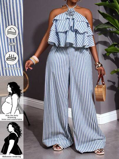 SHEIN CURVE+ 大码女装/秋季服装/秋季女装/冬季女装/冬季女装大码条纹印花荷叶边吊带连体衣
