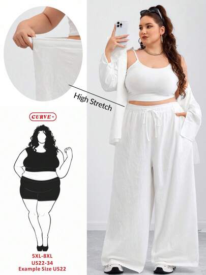 SHEIN CURVE+ Curves 大码/学校服装/返校服装/返校女士大码 100% 纯棉休闲抽绳直筒裤 - 白色 - 查看 10