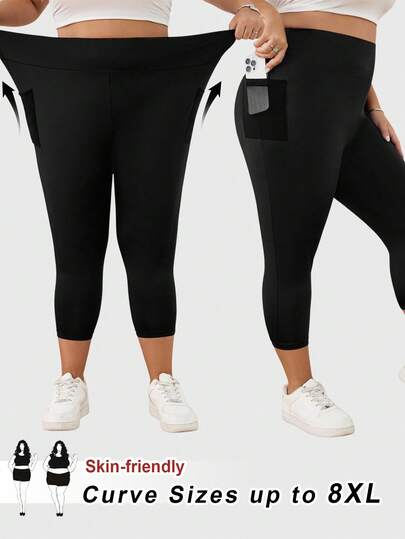 SHEIN CURVE+ 大码女式黑色口袋紧身裤,女式秋季服装,冬季,CURVE PLUS/秋冬 - 黑色 - 查看 6