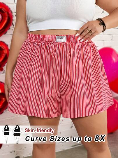 SHEIN CURVE+ 大码女士休闲宽松高腰字母条纹松紧腰短裤夏季 - 紅色 - 查看 1