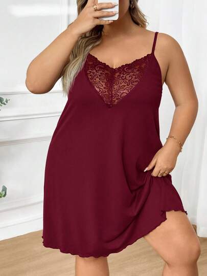 SHEIN CURVE+ 大码女式撞色蕾丝宽松吊带连衣裙夏季/乡村/海滩度假装/沙滩装/沙滩装 - 酒紅色 - 查看 1