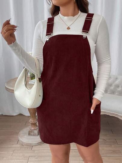 SHEIN CURVE+ 大碼素色背帶洋裝不帶T恤 - 酒紅色 - 查看 1