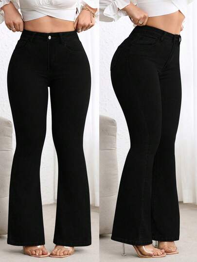 SHEIN CURVE+ 冬季加大码女式牛仔弹力修身喇叭裤,性感牛仔/竞技风格 - 黑色 - 查看 1