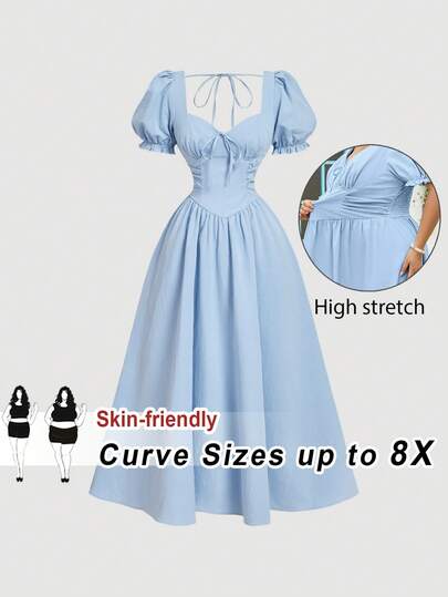 SHEIN CURVE+ 女士优雅短袖中长连衣裙,扭结心形领口,春夏连衣裙,适合婚礼、婚礼、优雅连衣裙、下午茶派对、田园风连衣裙、假日、生日、节日、下午茶派对、泡泡袖连衣裙、复古风、沙滩连衣裙、蓝色连衣裙、迷人风、野餐、派对、舞会、节日和生日穿着、长款派对连衣裙、毕业礼服、优雅仪式礼服、野餐连衣裙、夏季连衣裙