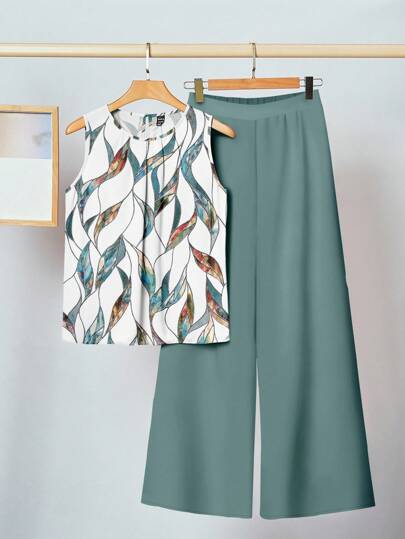 SHEIN Clasi 休闲百褶无袖上衣和阔腿裤套装,树叶印花,适合夏季 - 彩色 - 查看 1