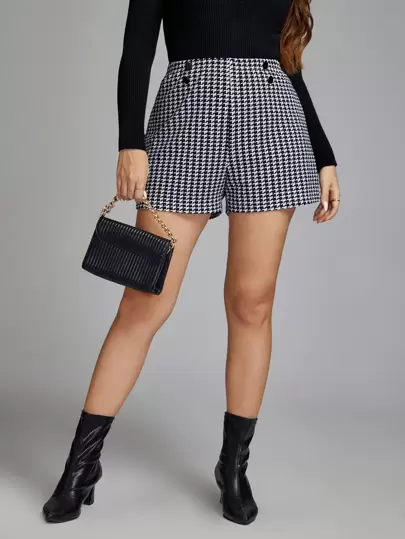 SHEIN Clasi 大碼千鳥格印花鈕扣細節短褲 - 黑與白 - 查看 1