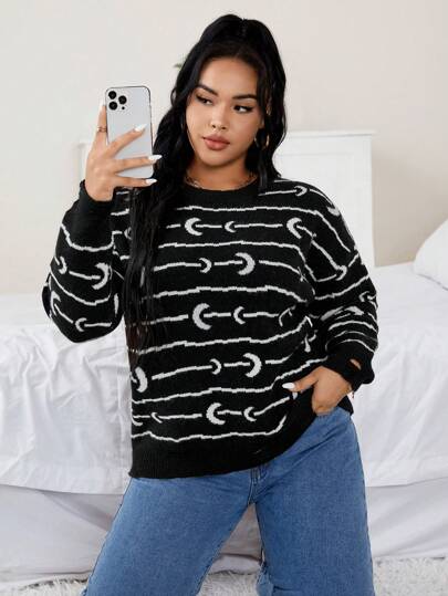 SHEIN Clasi 月亮图案落肩针织套头衫秋冬毛衣 - 黑色 - 查看 1