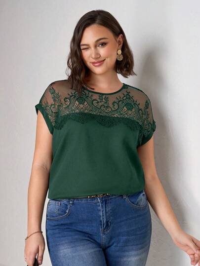 SHEIN Clasi 大码蕾丝拼接纯色休闲短袖衬衫
