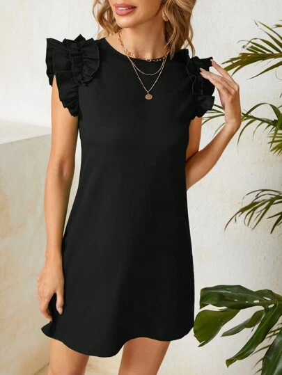 SHEIN Clasi 圓領荷葉邊裝飾針織連衣裙 - 黑色 - 查看 1