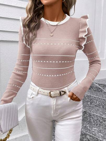 SHEIN Clasi 女士圆领长袖条纹荷叶边下摆修身毛衣,秋冬款 - 粉色 - 查看 1