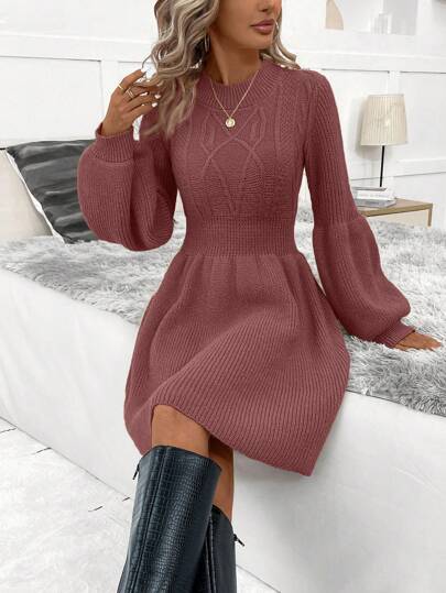 SHEIN Clasi 女士圆领针织灯笼袖毛衣连衣裙 - 鏽棕色 - 查看 1