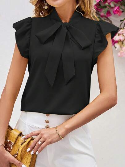 SHEIN Clasi 女士蝴蝶结缎带盖袖优雅衬衫、无袖上衣 - 黑色 - 查看 1