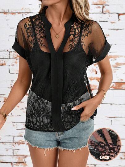 SHEIN Clasi 女式性感蕾丝拼布透明拼接缺口领衬衫 - 黑色 - 查看 1