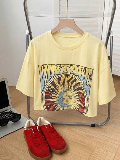SHEIN Comfortcana 加大码粉色宽松太阳印花T恤,春夏款