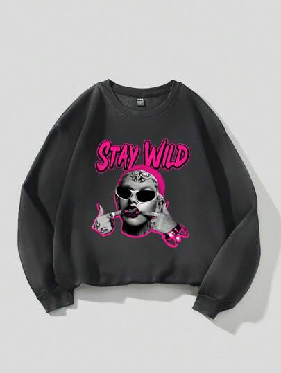 SHEIN EZwear 女式人物及字母印花保暖衬里运动衫 - 深灰色 - 查看 1