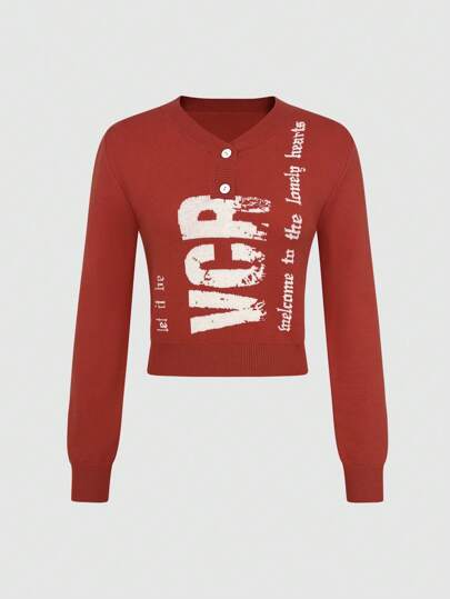 SHEIN Unity 红色V领毛衣,饰有英文字母,针织套头衫,秋冬毛衣 - 紅色 - 查看 1
